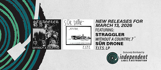 This month Frontier brings us SÜR DRONE – T.I.T.S. LP with cover art by RAYMOND PETTIBON and limited to 1200 copies on ocean blue and white swirl vinyl! To Live a Lie has a hardcore/punk 7″ by Oakland’s STRAGGLER – Without A Country. This is limited to 300 copies!