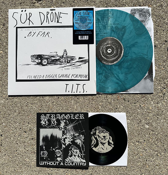 This month Frontier brings us SÜR DRONE – T.I.T.S. LP with cover art by RAYMOND PETTIBON and limited to 1200 copies on ocean blue and white swirl vinyl! To Live a Lie has a hardcore/punk 7″ by Oakland’s STRAGGLER – Without A Country. This is limited to 300 copies!