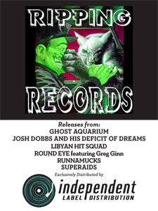 Ripping Records started in 2007 as a way to promote the scene at the now-demolished Hazel St. duplex in Orlando, Florida; home to the Danger Room Recording Studio and the bands RunnAmuckS, SuperAIDS and Ghost Aquarium. After Libyan Hit Squad recorded their debut album in the Danger Room, the bands decided it would be in their best interest to put all their music out under one roof as well, influenced by the diversity of SST Records in the 1980′s. Numerous records and tours later, Ripping is going stronger than ever, releasing two full-lengths in early 2013: RunnAmuckS Deficit of Dreams and the Full Circle split LP by Libyan Hit Squad and Round Eye from China, featuring Greg Ginn of Black Flag, who helped inspire it all.